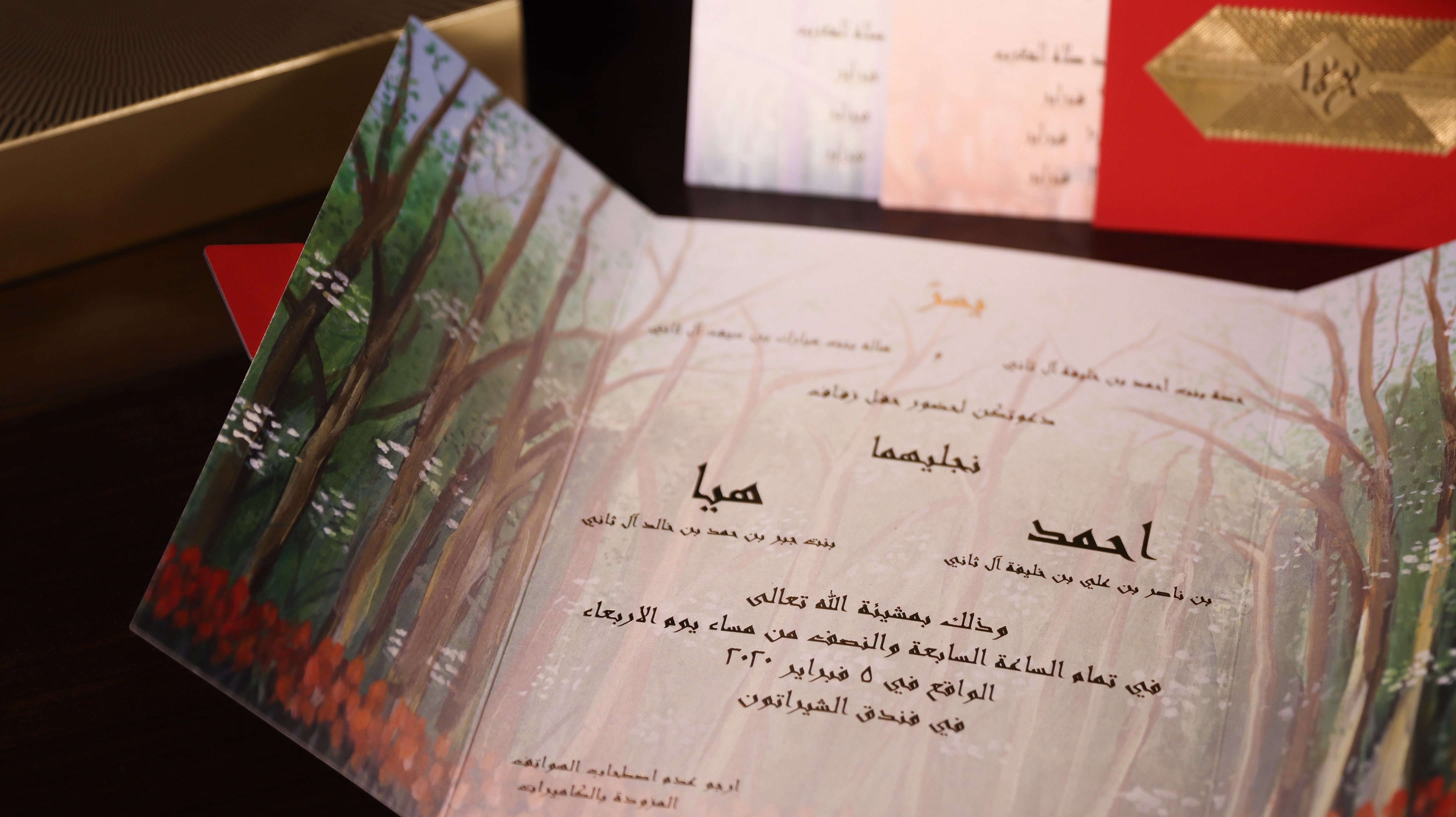 Iconic English countryside paintings by David Hockney, the bride’s favorite artist, offered precious inspiration for this luxurious invite with classic charm. The standout red box with self-on-self foiling carries a sleek pattern that is offset with the rich metal-on-metal plated monogram at the center. Inside the box you find an artwork of the bride walking down a path to her future. The art theme flows through the inserters held neatly in a secret pocket of the envelope. A design masterstroke to complement the brush strokes of the master painter.